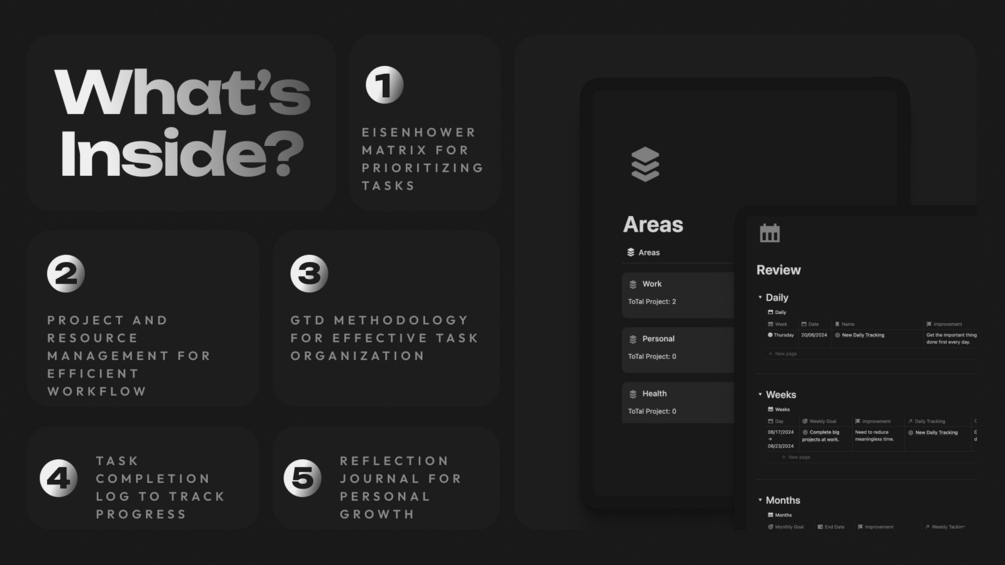 - Area Management: Systematically organize and manage tasks and goals across different life or work areas.