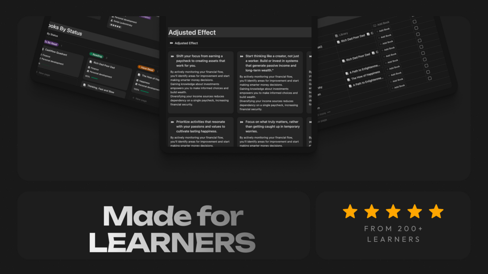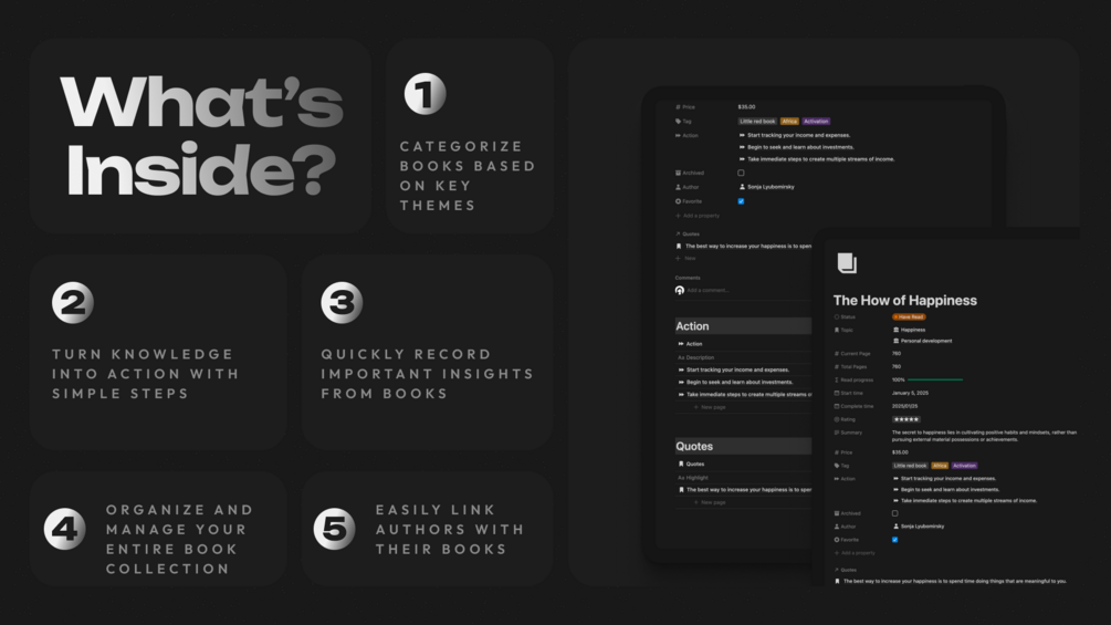 - Action: Turn your knowledge into actionable steps by setting practical goals, creating tasks, and tracking your progress from learning to execution.