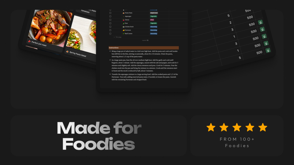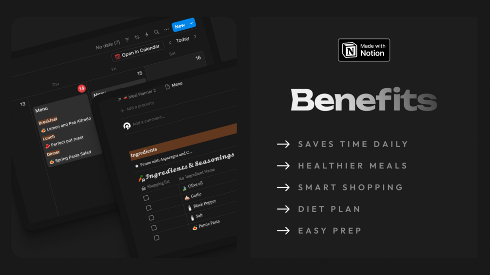 Notion is a free-to-use single digital space where you can think, write, and plan. Capture thoughts, manage projects, or even run an entire company — and do it exactly the way you want. Meal Planner is built inside Notion and is easy to use and set up even with no prior knowledge. -