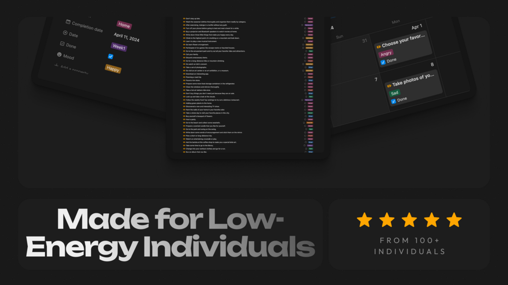 This notion template includes 100 small things to help you recharge your energy.
